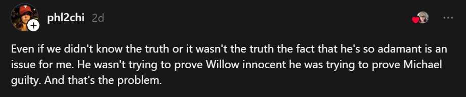 Willow on the other hand – has been a slow descent into “madness”. Do I think she is crazy – well, she was crazy like a fox to pull off that second assault on Drew. Willow begin like Nelle as a victim of her environment: the cult, and being a people pleaser. She never received mental health threatment for what she has gone through over the past 7 years since moving to PC. And it has manifested in her loosing the two people that she thought identified her: the children. So she broke and took it out on the one person who she percieved failed her: Drew.