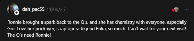 For me the brightest spots of the week were the possibility of a real truce between Sonny and Ric (and Alexis!) and seeing the “real” Marty back again. Totally agree that peace between Sonny and Ric is waaaaay more interesting than the endless and repetitive sniping.