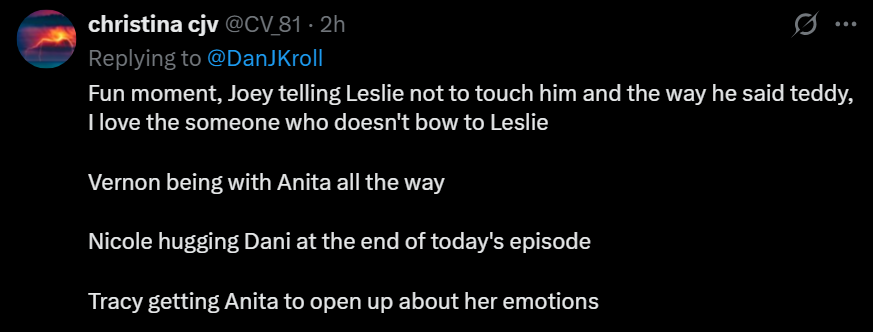 I don’t think that Leslie necessarily needs to be given any more leverage over the Duprees or anyone else for that matter. As I mentioned in my Worst of 2025 column, I think most viewers wants to see Leslie suffer some kind of loss. She’s gotten away with a little too much and it is time for karma to swoop in and even up the score a little bit.