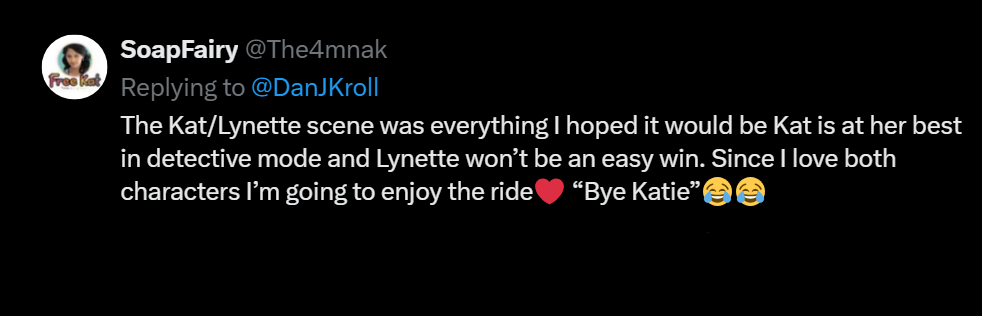 Kat is a very determined young woman. I donโt think sheโs going to give up on probing Hayley and Lynetteโs connection. Unlike her involvement in the โred marketโ blood and plasma theft, I donโt think Kat is any kind of danger here. Yes, Hayley is actively trying to off Bill, but I donโt see her trying to do the same to Kat.