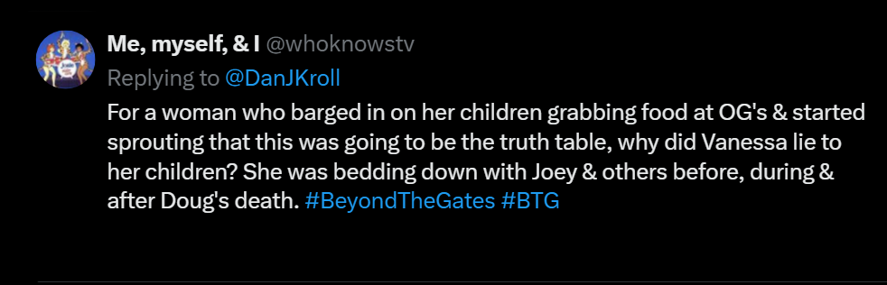 Vanessa’s partial truth-telling raised some eyebrows for others, too. Funny note. When I first read the response, I mistook OG as Olive Garden and wondered when Vanessa and her kids were seated for unlimited breadsticks!