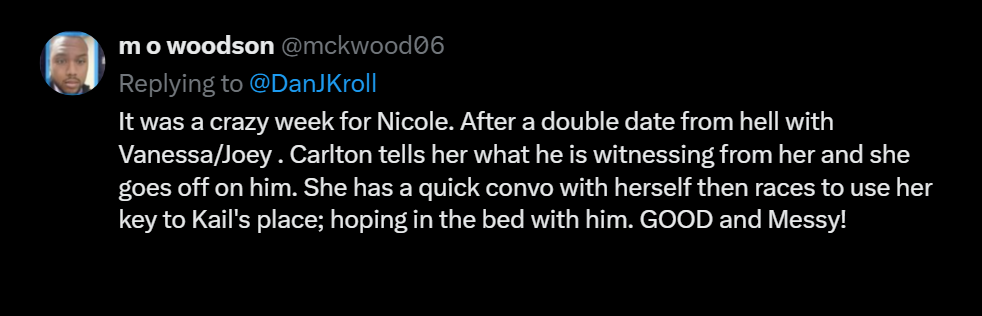 There was a bit of a fake out there that got me good. Carlton took a long, long pause after dropping the word โlove.โ I thought he was going to admit that he loved Nicole. But, no. He simply loved spending time with her.