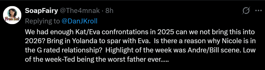 While not calling for the “cordial contempt” mentioned earlier in the column, SoapFairy is also wanting less of the Kat and Eva bickering.