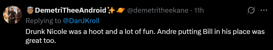 Like I said, I know I am in the minority about Drunk Nicole — and DemetriTheeAndroid and Christina prove it!