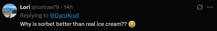 I know the question was probably rhetorical, but I’d suspect that sorbet being dairy-free and primarily fruit forward is a big reason that people choose it as a dessert option. Now why sorbet is ranked above ice cream in the realm of innuendo, I have absolutely no idea, Lori!