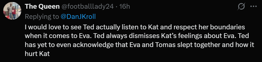 Likewise, Evaโs reaction to what Kat said was also not cool. I donโt think that it means that Evaโs concern was insincere. Eva said that the only reason she gave the fence-mending a shot was because Ted had asked her to. I think the sentiment is real, it was just that Eva would have kept it to herself had it not been for Ted. Regardless, Eva slipping back into familiar territory of lashing out wasnโt the best look.