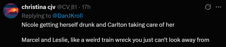 I am in the minority here, but I didn’t enjoy Nicole’s drunken date with Carlton — and for once it had nothing to do with Carlton. A lot of the comments that I saw on social media seemed to be from people who liked seeing Nicole let her proverbial hair down and allow herself to be less than perfect. Me? I saw someone with a lot of horrible things happening in her life drowning her sorrows in booze.